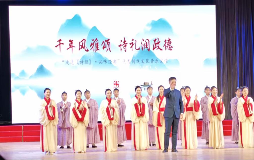本次音乐党课使学生深入感悟《诗经》中的政德智慧,增强了党团集体的凝聚力。活动现场,背景屏山水诗意图景铺展,教师们身着传统服饰登台,以“千年风雅颂 诗礼润政德”为主题,用优美的舞蹈和婉转的歌声串联起《诗经》的文化内涵与时代价值。活动开篇,文化讲师围绕《诗经》中《蒹葭》《鹿鸣》《南山有台》《子衿》等经典篇目展开鉴赏分享:从《秦风·蒹葭》里“白露为霜”的朦胧追慕,到《小雅·鹿鸣》中“鼓瑟吹笙”的宴饮和乐;从《小雅·南山有台》“乐只君子,邦家之基”的颂德之语,到《郑风·子衿》“青青子衿,悠悠我心”的婉转情思,解析这些篇目里藏纳的先民情志与文化底色,让同学们直观触摸到《诗经》跨越千年的精神温度。