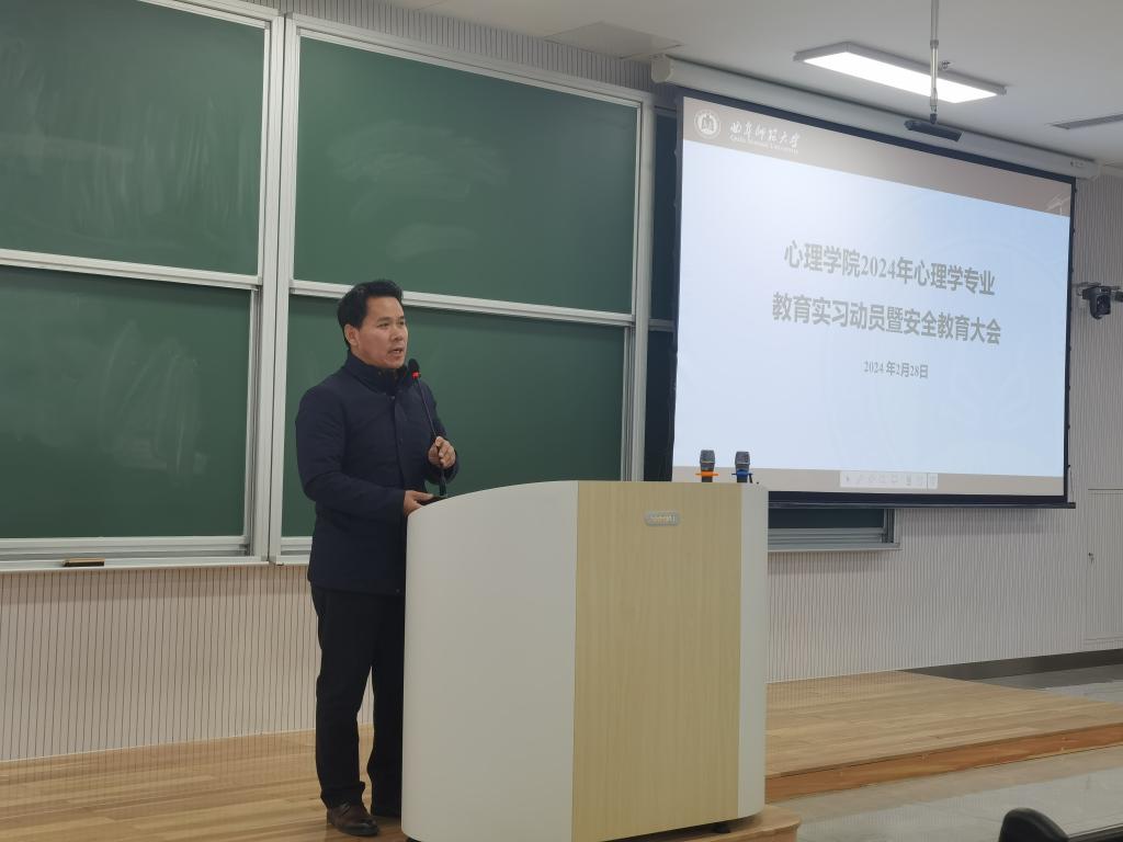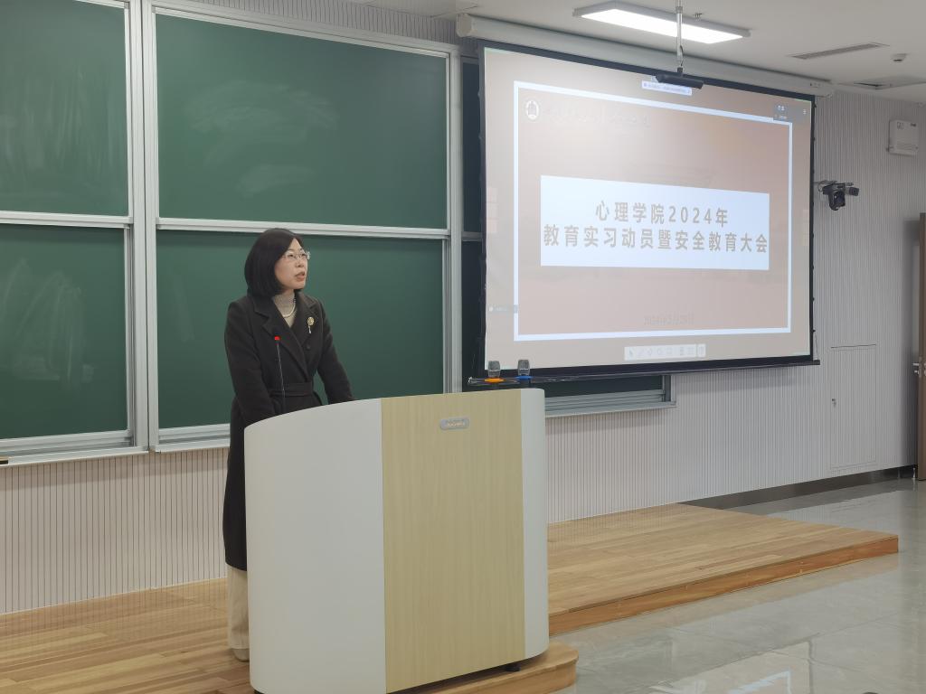 在致知楼B102召开2024年实习动员大会,安排部署2021级心理学专业和2022级专业硕士本学期教育实习工作。会议由副院长李海青主持,院长何文广、党委副书记朱伟卫、副院长王晓明、全体实习指导教师和实习学生参加了此次会议。