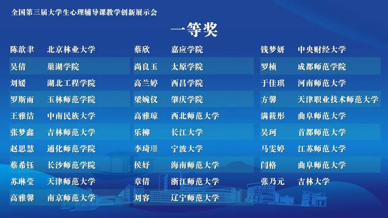 讯(通讯员:杨加芹)2024年4月25日至26日,全国第三届大学生心理辅导课教学创新展示会在浙江桐乡举办,大赛由教育部高等学校心理学类专业教学指导委员会、中国心理学会主办,浙江师范大学、华东师范大学、桐乡市教育局承办。共设立特等奖29名,一等奖59名,二等奖56名。经蜘蛛直播官网