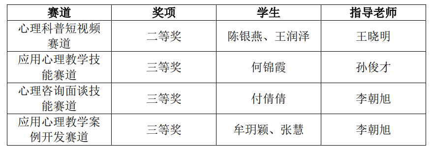 本次大赛以“面向中国式现代化的应用心理专业学位研究生培养:创新与实践”为主题,设立心理咨询面谈技能、应用心理教学技能、应用心理教学案例开发和心理科普短视频四个赛道。共计112家培养单位参与初赛,最终有72家单位、126个作品进入本次决赛。经过初赛、决赛的激烈角逐,我院研究生陈银燕、何锦霞、付倩倩、牟玥颖等学生共斩获四个赛道的四个奖项,取得骄人成绩。《正念——帮助你走出生活困境》《探索自我——发现多维的我》《一例学业焦虑研二女生心理咨询案例》《“呵护荆棘中的花朵”—教师干预下离异家庭学生心理成长探索》四个作品分别获得2023年全国应用心理专业学位研究生实践技能大赛二等奖、三等奖。