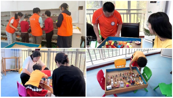 志愿者同指导中心的孩子们用沙盘进行游戏