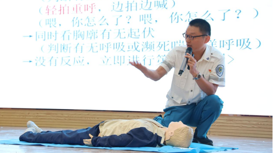 图3 济医附院急救培训师讲解心肺复苏术与海姆立克急救法