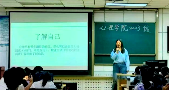 许家玮在分享中提及,规划生涯的前提是了解自己,可以通过现有的心理学资源进行职业测试、人格测试,锁定适合自己的学习方法、科研方向以及爱好培养,适合自己的才是最好的。刁子桐则从学业、工作、日常三个角度出发,联系自己的亲身经历,强调学习重在思考,只有建立体系、融会贯通,知识才能得心应手地运用;工作方面,会有烦恼也会有成长,放平心态、抬高眼界是制胜法宝;最后,两位优秀的朋辈榜样都提到希望同学们能热爱生活,并同2023级新生就课程选择、恋爱观念等问题展开交流。