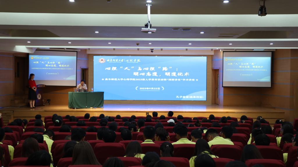 宋广文以“心理’人’与心理’路’:明心志道 明道优术”为题进行学术讲座。讲座伊始,宋广文对2023级新同学表示了热烈的欢迎和衷心的祝贺,并对本次讲座的题目中“明心志道”“明道优术”两个关键词进行了内涵解读,随后简要介绍了个人的求学经历与感悟,并指出本次讲座主要包含两大主题,其一是适应与发展:大学新生的自我超越;其二是问道与通达:心理学人的成长之境。