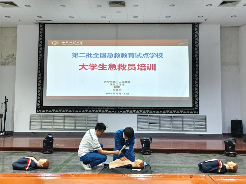 培训中,专家详细讲解并展示了心肺复苏、海姆立克急救和AED除颤仪操作等关键技能,并与现场师生互动演练,强调“黄金四分钟”内采取急救的重要性。我院教师代表吕超和学生代表满金宏、王家瑞、王昊等积极参与实操练习,掌握急救要领。