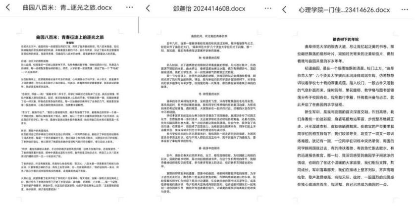 本次征文以“我与曲园的故事”为主线旨在以文学为载体,凝聚师生共识,为七秩校庆注入人文温度。同时,通过梳理与曲园的故事,鼓励学生围绕在校期间的学习成长、师生情谊、校园生活等主题,书写真实动人的青春记忆。学子们纷纷提笔追忆点滴:从图书馆前的晨读剪影,到心理学课堂的思辨火花;从社团活动的协作温情,到实验室里的攻坚岁月……字里行间尽显曲园学子的成长足迹与赤子情怀。