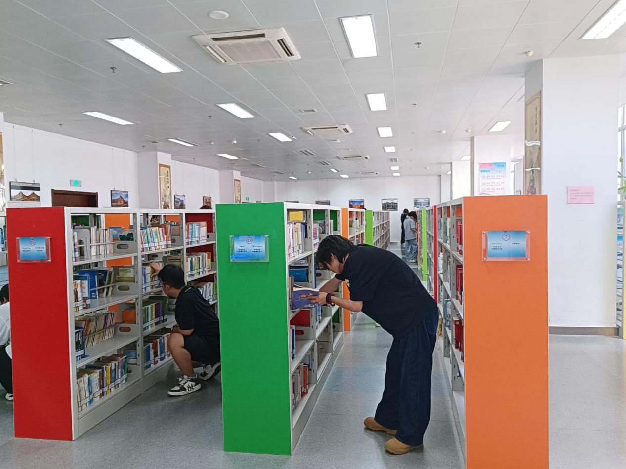 社区图书馆的幼儿借书室,是实践队开展服务的首站。作为社区孩童假期阅读的高频场所,这里汇聚各类幼儿绘本、图书。活动伊始,实践队成员们跟随工作人员系统学习图书分类规则,随后逐本核对图书的编号,将归还的图书高效精准归位。周二是图书馆每周开放首日,面对大量待整理的书籍,馆内工作人员表示:“每周一次大规模整理,既方便孩子找,又能让家长快速定位。”实践队成员特意把低龄幼儿认知类绘本放在下层,还设置“亲子共读推荐区”,将适合家长陪读的情感启蒙、科普绘本集中展示。整理时,遇到带孩子还书的家长,成员们会主动交流书籍内容,温馨互动中,不仅让幼儿借书室恢复整洁有序,也传递了“爱书护书”的理念,引导家长重视孩子阅读习惯培养。