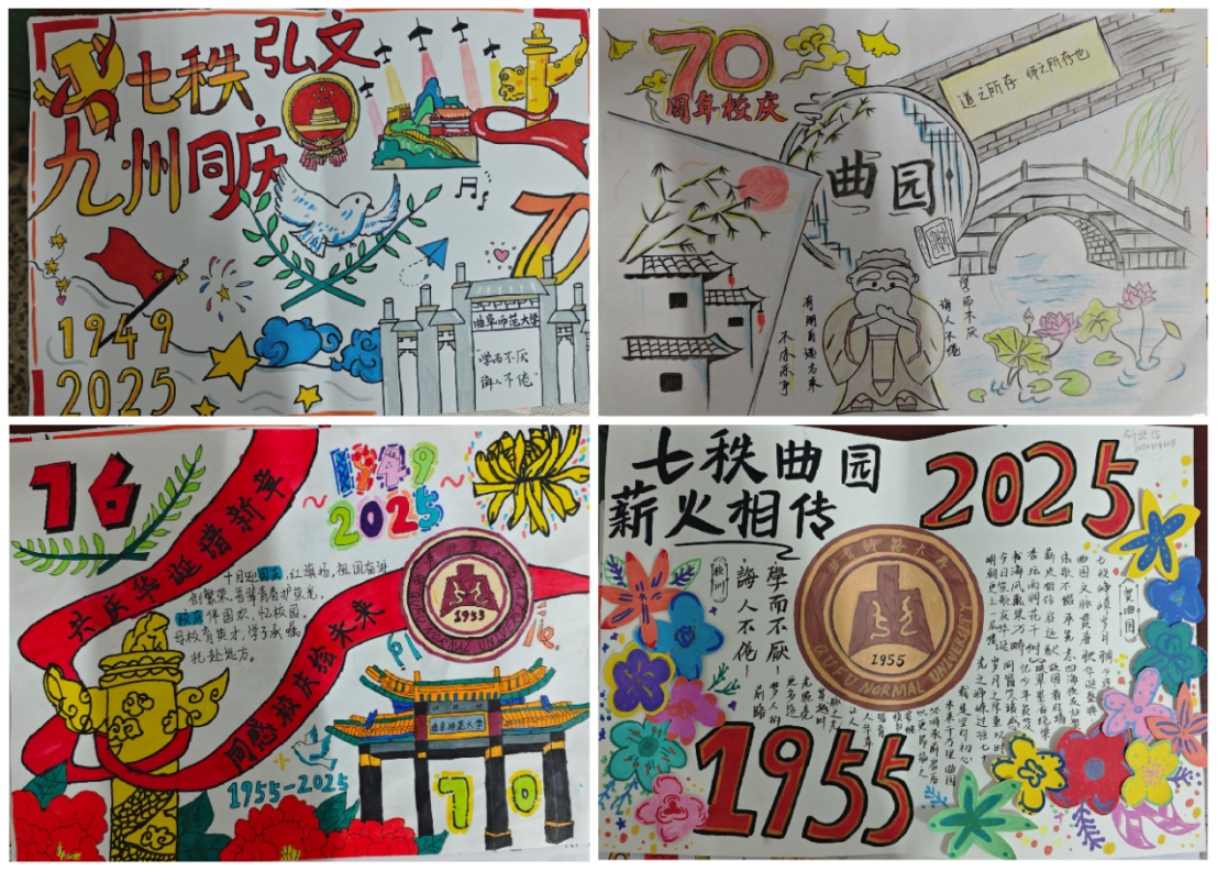 学子深厚的家国情怀、人文素养与蓬勃的艺术创造力。在“颂华诞”的主题下,同学们笔下涌现出万里长城的宏伟、神舟飞船的英姿、繁华都市的烟火,以及各族人民欢庆的笑脸。在“贺校庆”的篇章里,曲园的一草一木、一砖一瓦皆可入画。这些作品定格了独属于曲园学子的青春记忆,流淌着对母校最深沉的眷恋与祝愿。