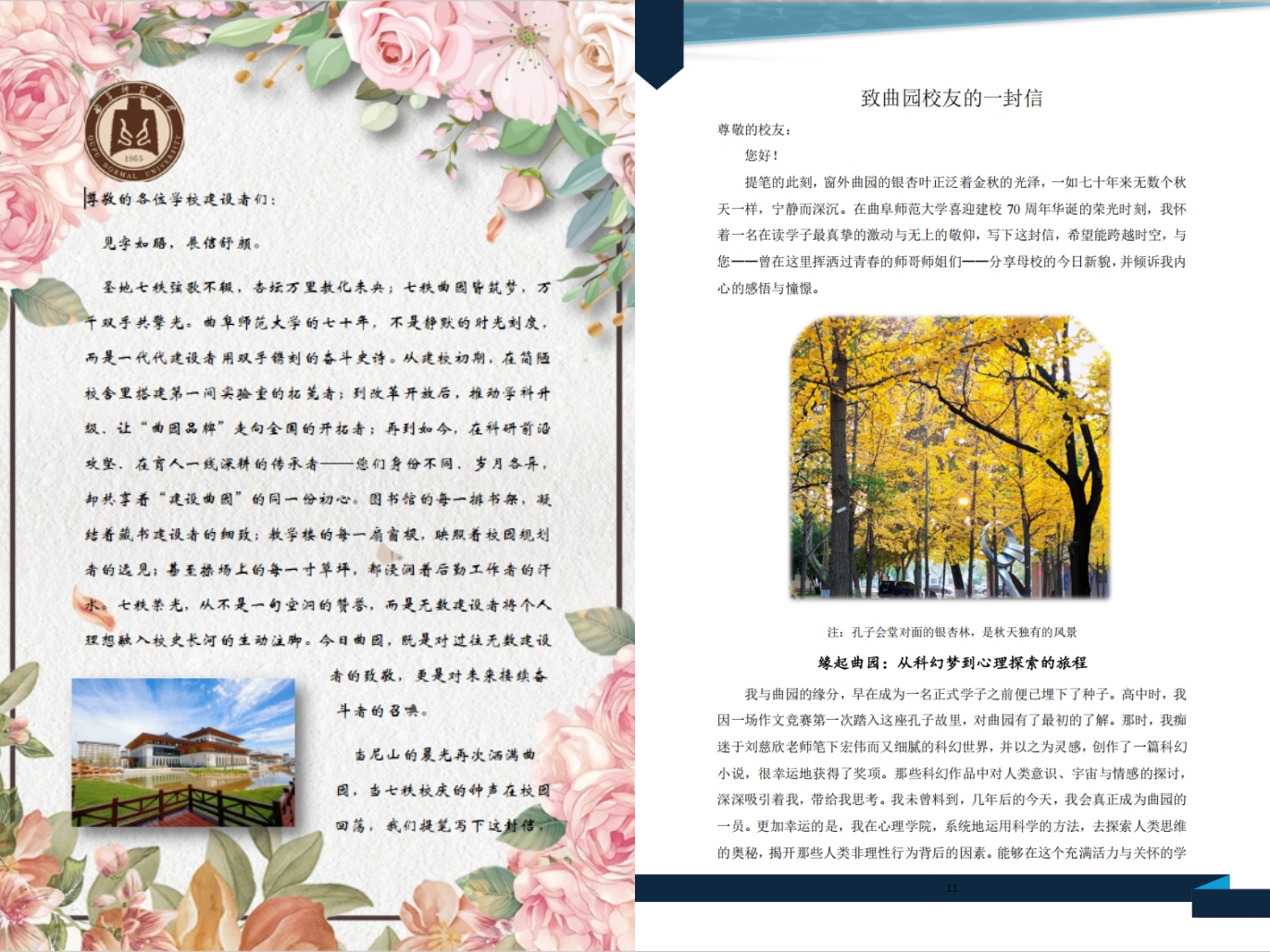 本科生纷纷致信校建设者,争先讲述曲师大70周年校庆与学校发展,更有学生附上曲园照片加以展示。截至作品征集结束,蜘蛛直播官网