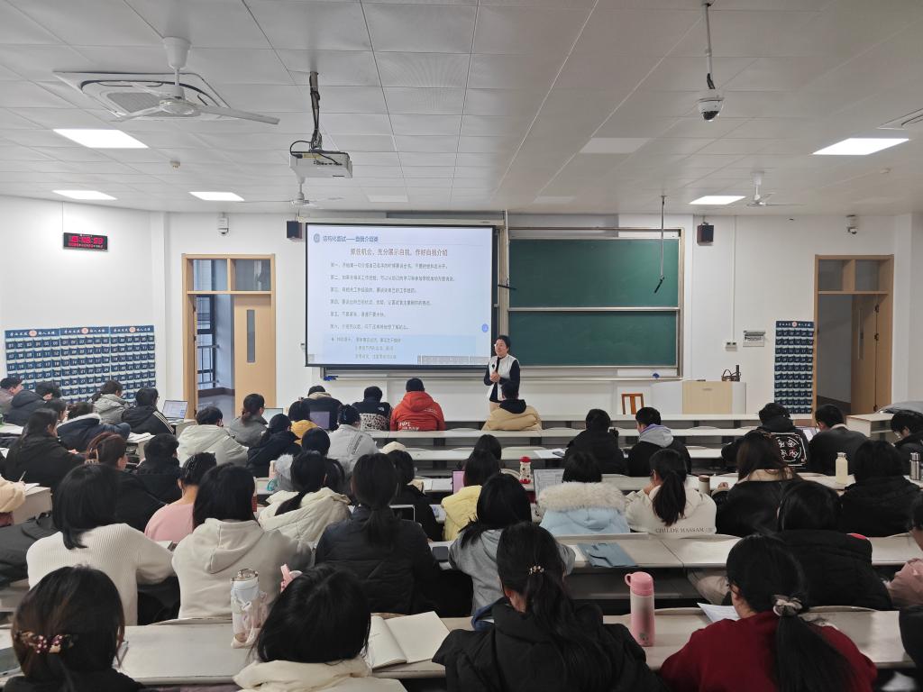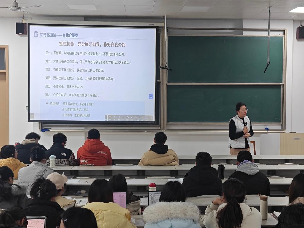 党委副书记朱伟卫担任主讲人,朱伟卫结合多年学生就业指导经验,从面试前的心理调适、形象管理到常见题型应答策略进行系统讲解。