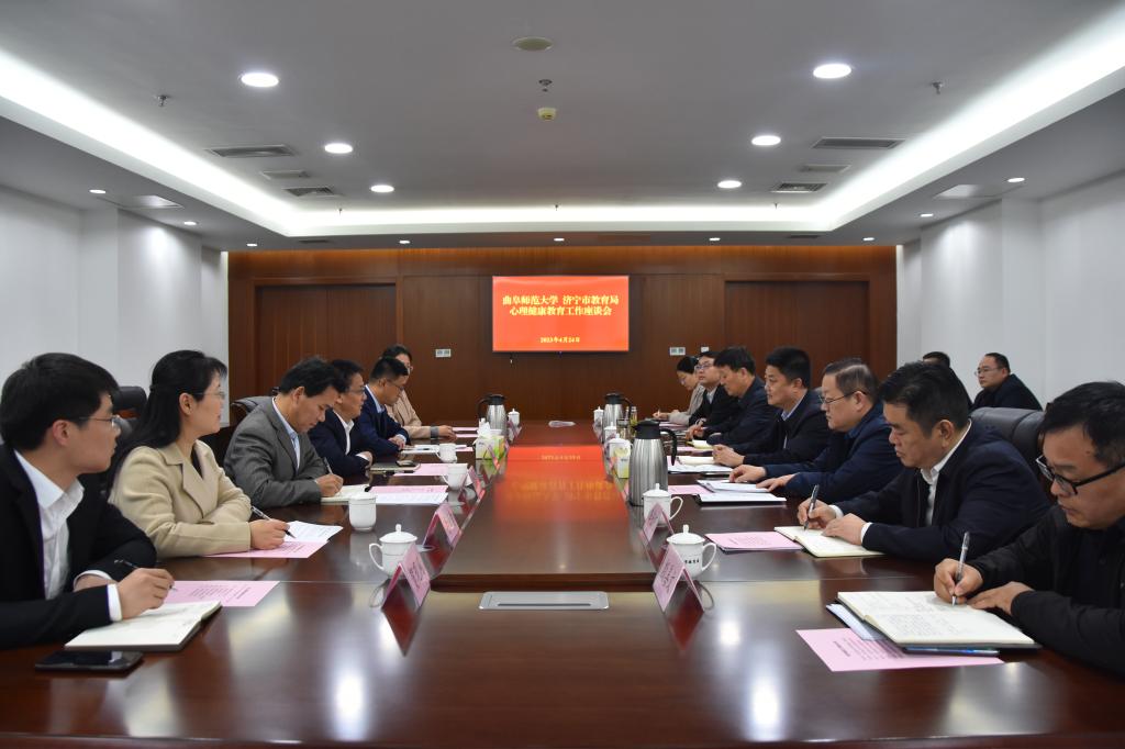在济宁市教育局,胡凡刚对济宁市委市政府多年来对曲阜师范大学的大力支持表示感谢,全面介绍了学校的发展情况,并表示,希望以本次访企拓岗和社会心理服务体系建设调研交流为契机,促进双方在师资培训、科研共同体建设、社会心理服务体系建设等方面的深层次合作交流。济宁市委教育工委常务副书记、教育局党组书记、局长王洪正对胡凡刚一行表示热烈欢迎,他说,曲阜师范大学“桃李满天下”,毕业生在各行业中都是佼佼者,济宁市因有曲阜师范大学而引以为傲,希望通过此次调研交流活动,能够促进彼此产教融合,提高济宁市教育质量,全面建设好济宁市教育系统心理服务体系,治好“未病之病”。随后,双方在教师招聘、人才智库、实习实践基地建设、心理健康教师培训、心理普查、家庭体育、科研流动站等方面进行了深入研讨。