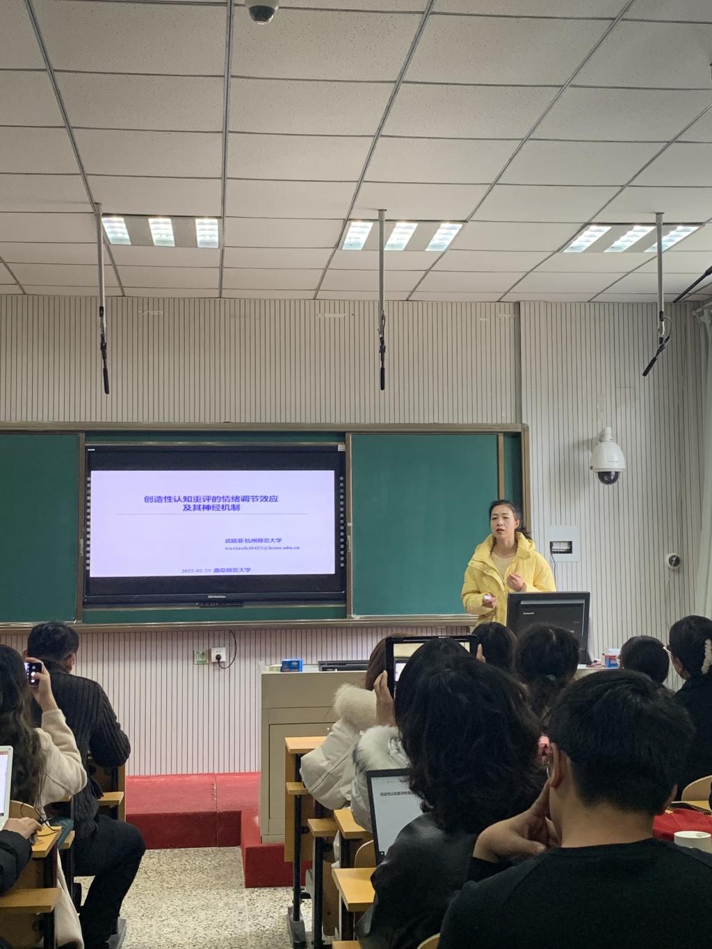 武晓菲博士详细介绍了创造性认知重评的概念以及情绪调节效果的机理,阐述创造性认知重评材料库建立的过程,探索并检验了幽默重评对负性情绪刺激的调节作用及其神经机制,并将研究成果应用于指导中小学教师进行情绪调节,编制了操作手册。在场师生与武博士热烈互动,深入交流和讨论了相关问题,获得了很多研究启发。