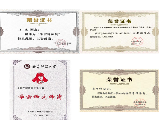 党委书记罗文伟创作的《育心与育德相结合 培养心身健康的时代新人》荣获2023年度十佳新闻作品;教师吕邈获评“学雷锋标兵”,研究生党支部荣获学雷锋先锋岗;研究生会新媒体部部长朱珂妍获评2023年度优秀信息员。
