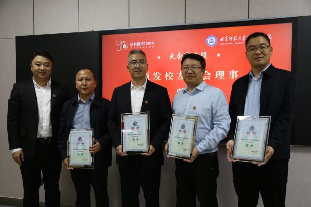 校友分会理事会成员名单,选举产生了分会会长、副会长、秘书长等。在热烈的掌声中,刘涛为校友分会会长、副会长、秘书长颁发聘书,徐腾飞为校友分会理事颁发聘书。