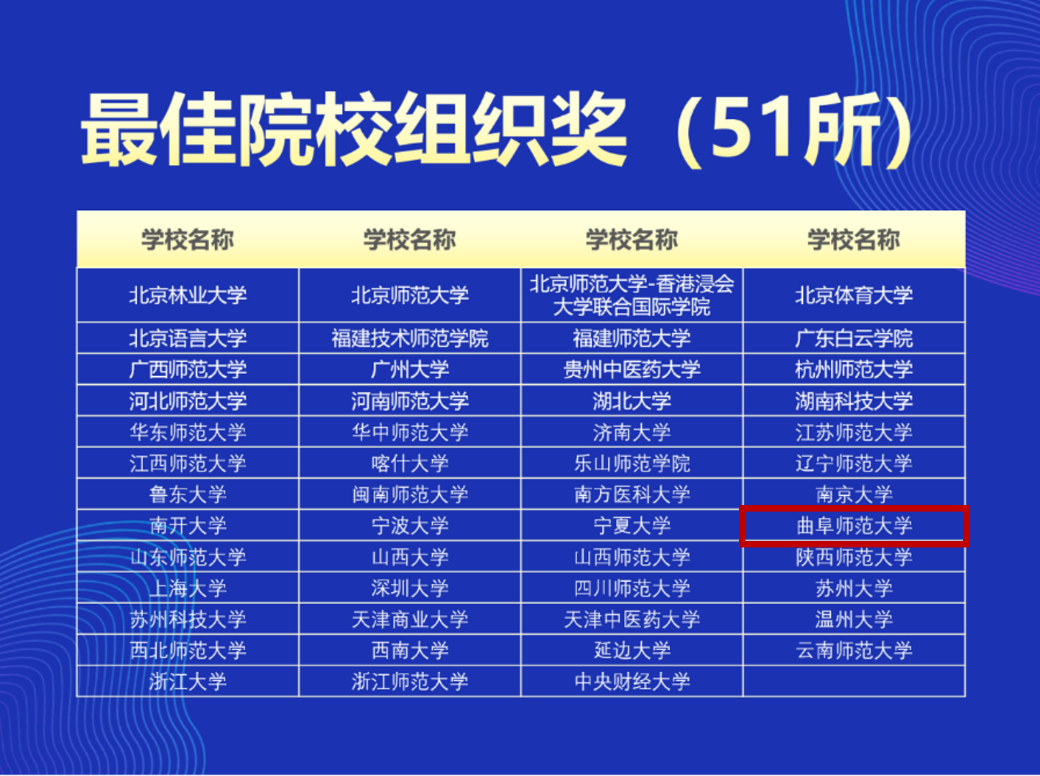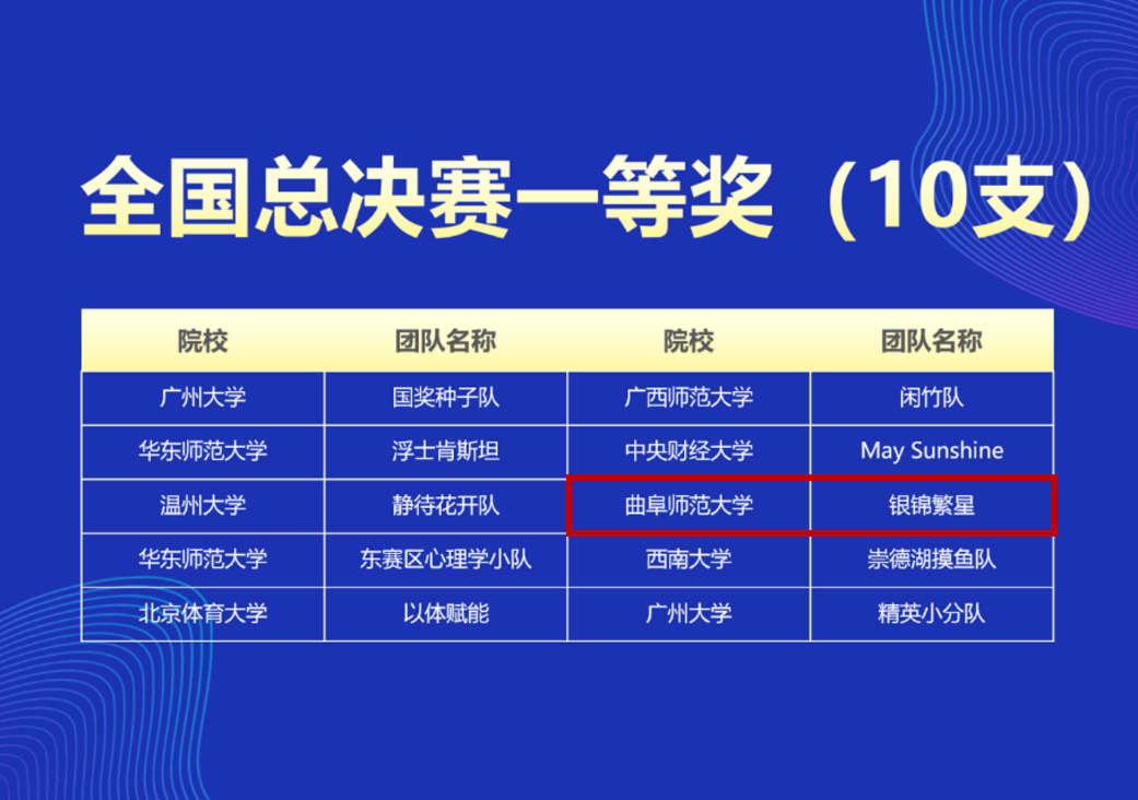 我校所在东部赛区累计有230支队伍,我院晋级到分赛区竞赛的3支队伍分别获得了分赛区竞赛一等奖1项、三等奖2项。其中,获得分赛区竞赛一等奖的“银锦繁星”团队成功晋级全国总决赛,与全国总决赛中的其他52支队伍进行激烈角逐,最终在“自选赛道”的31支队伍中脱颖而出,获得全国总决赛一等奖同时,曲阜师范大学获得“最佳院校组织奖”,王晓明副教授获得“优秀指导老师”称号和“年度十佳导师”称号。